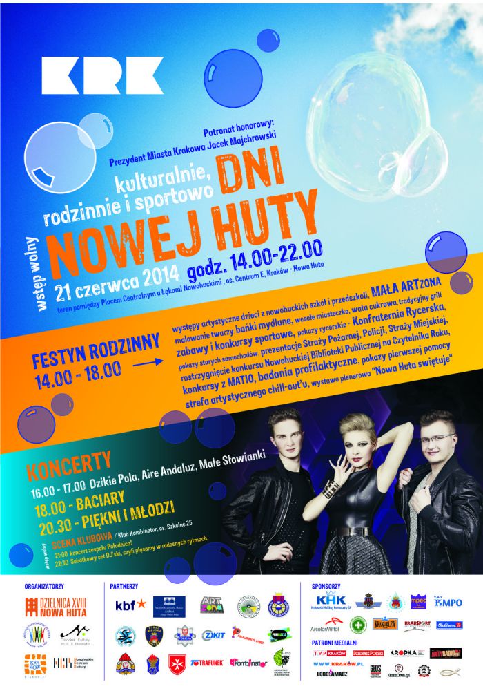 Od godziny 16.00 do 17.00 zapraszamy na występy zespołów Dzikie pola, Aire Andaluz i Małe Słowianki. Dzień pełen wrażeń w plenerze zakończš koncerty specjalne, o godz. 18.00 dla nowohucian zagra zespół „Baciary” a o godz. 20.30 zespół „Piękni i Młodzi”. O 22.15 pożegnamy tegoroczne Dni Nowej Huty pokazem sztucznych ogni.