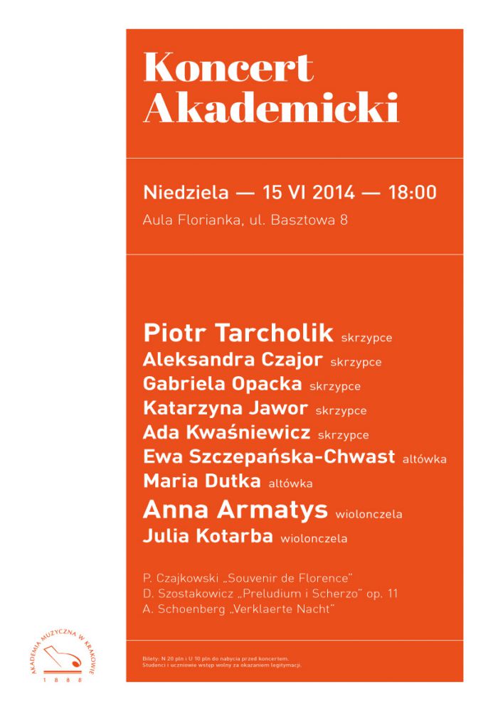 W ramach Koncertw Akademickich organizowanych przez Akademi Muzyczn w Krakowie, w najblisz niedziel 15 czerwca 2014 o godz. 18:00 w Auli Florianka (ul. Basztowa 8) wystpi krakowscy kameralici: