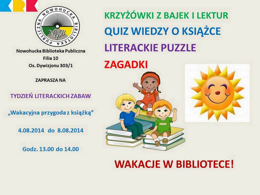 W dniach 4 VIII8 VIII 2014 r. w Filii nr 10 bdzie trwa Tydzie Zabaw Literackich - Wakacyjna przygoda z ksik. Uczestnicy zaj poznaj podstawowe terminy zwizane z ksik i bibliotek oraz nabd umiejtno szybkiego kojarzenia tytuu z autorem. Ponadto zapoznaj si z aktualn ofert ksigozbioru biblioteki i naucz si obsugiwa elektroniczny katalog. Bd te rozwizywa literackie krzywki, wezm udzia w quizie oraz wykonaj zakadki do ulubionej ksiki.