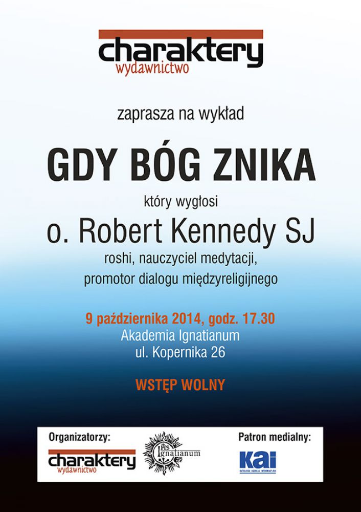Wydawnictwo Charaktery zaprasza na otwarty wykład "Gdy Bóg znika" o. Roberta Kennedyego w Polsce. O. Robert Kennedy jest jezuitš i mistrzem zen. więcenia otrzymał w Japonii, gdzie praktykował i studiował zen u Roshiego Kouna Yamady. Po powrocie do Stanów Zjednoczonych w 1998 roku, kontynuował buddyjskie studia oraz praktykę zen. Jako pierwszy ksišdz katolicki w USA otrzymał honorowy tytuł Roshi. Kieruje Katedrš Teologii w Saint Peters College w Jersey City. Jest praktykujšcym psychoterapeutš w Nowym Jorku. Wydawnictwo Charaktery w ubiegłym roku wydało jego ksišżkę pt. Dary zen dla chrzecijan.