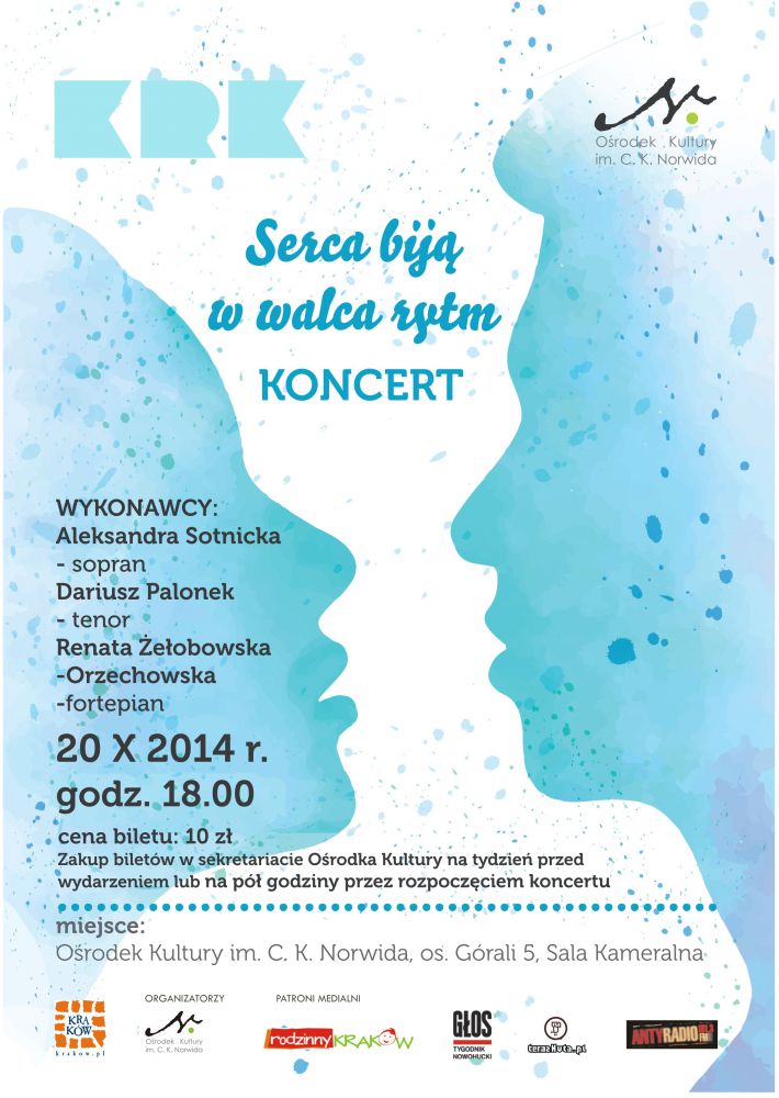 Koncert odbędzie się 20 padziernika 2014 r., o godz. 18.00 w Sali Kameralnej Orodka Kultury im. C. K. Norwida, os. Górali 5. Bilety w cenie 10 zł będš dostępne na tydzień przed wydarzeniem w sekretariacie Orodka Kultury lub na pół godziny przed koncertem. Serdecznie zapraszamy.