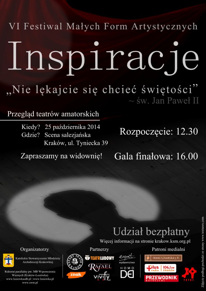 Zapraszamy na widownię kolejnej, już VI edycji Festiwalu Małych Form Artystycznych Inspiracje, który odbędzie się 25 Padziernika 2014 na Scenie Salezjańskiej.
