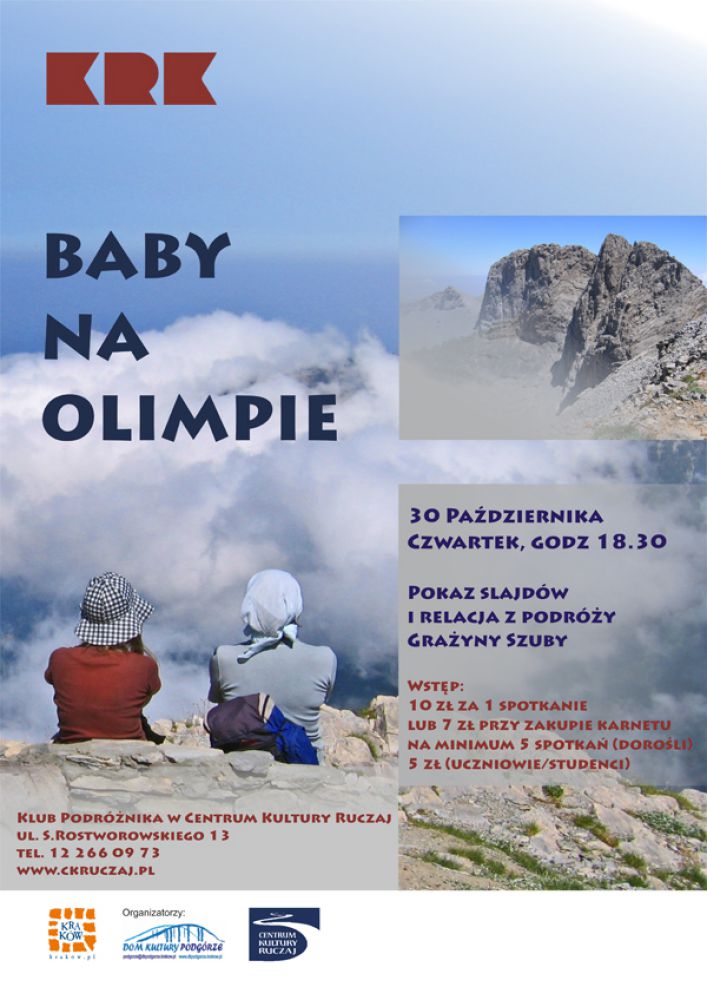 W programie: pokaz slajdów, prelekcja i promocja ksišżki Grażyny Szuby "Baba i góry". Ponadto degustacja potrawy regionalnej i herbaty olimpijskiej.