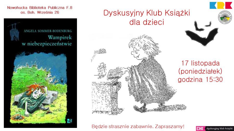 W cyklu: Tu czytamy Biblioteka zaprasza na spotkanie Dyskusyjnego Klubu Ksiki dla Dzieci, podczas ktrego bdzie czytana i omawiana ksika Angeli Sommer Bodenburg Wampirek w niebezpieczestwie. Angela Sommer Bodenburg to popularna niemiecka autorka ksiek dla dzieci i malarka. Seria ksiek o wampirku Rydygierze i Antosiu jest najbardziej znana w jej dorobku.