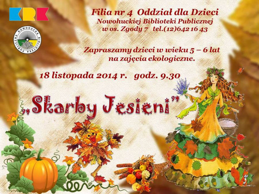 Biblioteka zaprasza najmłodszych czytelników w dniu 18 listopada 2014 r. na spotkanie w cyklu: Ekologia jest modna pn. "Skarby jesieni". Jesień dostarcza ogromnej iloci skarbów, które można wykorzystać w ciekawy sposób. Uczestnicy zajęć wysłuchajš opowiadań o skarbach jesieni, wezmš udział w zabawach ruchowych i wykonajš prace plastyczne z suszonych lici, które mogš posłużyć jako prezenty dla rodziców i dziadków. Zajęcia przyczyniš się do poszerzenia zasobu słownictwa dotyczšcego natury, będš też doskonałym sposobem na pobudzenie wyobrani i uwrażliwienie na piękno ojczystej przyrody.