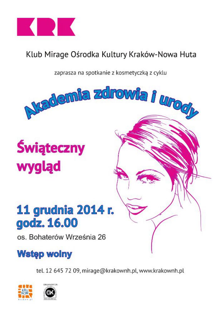 Klub Mirage Oœrodka Kultury Kraków-Nowa Huta zaprasza na przedœwišteczne spotkanie dla pań z ramach cyklu Akademia Zdrowia i Urody. Uczestniczki dowiedzš się jak w prosty sposób, po przedœwištecznym zamieszaniu i porzšdkach, wyglšdać pięknie i promiennie przy œwištecznym stole a odœwiętnym makijażem przykuwać wzrok goœci i domowników. Konsultantki wykonajš zabiegi na twarz oraz pokaz makijażu, udzielš indywidualnych porad a zainteresowani będš mogli zakupić polecone kosmetyki.
