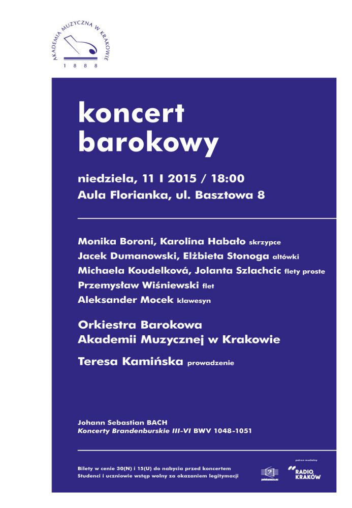 W niedzielę 11 stycznia o godzinie 18:00 w Auli Florianka Orkiestra Barokowa Akademii Muzycznej w Krakowie, którš poprowadzi Teresa Kamińska, przywita Nowy Rok.