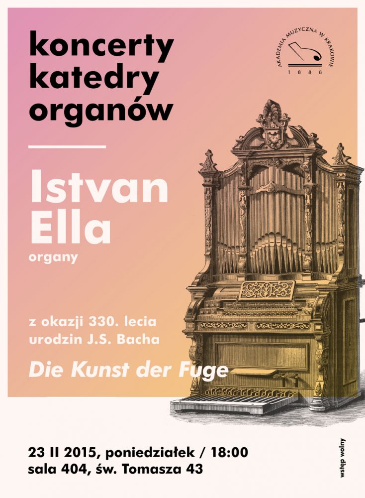 Katedra Organów Akademii Muzycznej w Krakowie zaprasza na Recital organowy Istvána Ella, który odbędzie się w poniedziałek 23 lutego o godzinie 18:00 w Sali organowej 404 przy ul. œw. Tomasza 43. W programie koncertu znajdzie się Die Kunst der Fuge BWV 1080, jedno z ostatnich, niedokończone dzieło Johanna Sebastiana Bacha, składajšce się z czternastu fug.