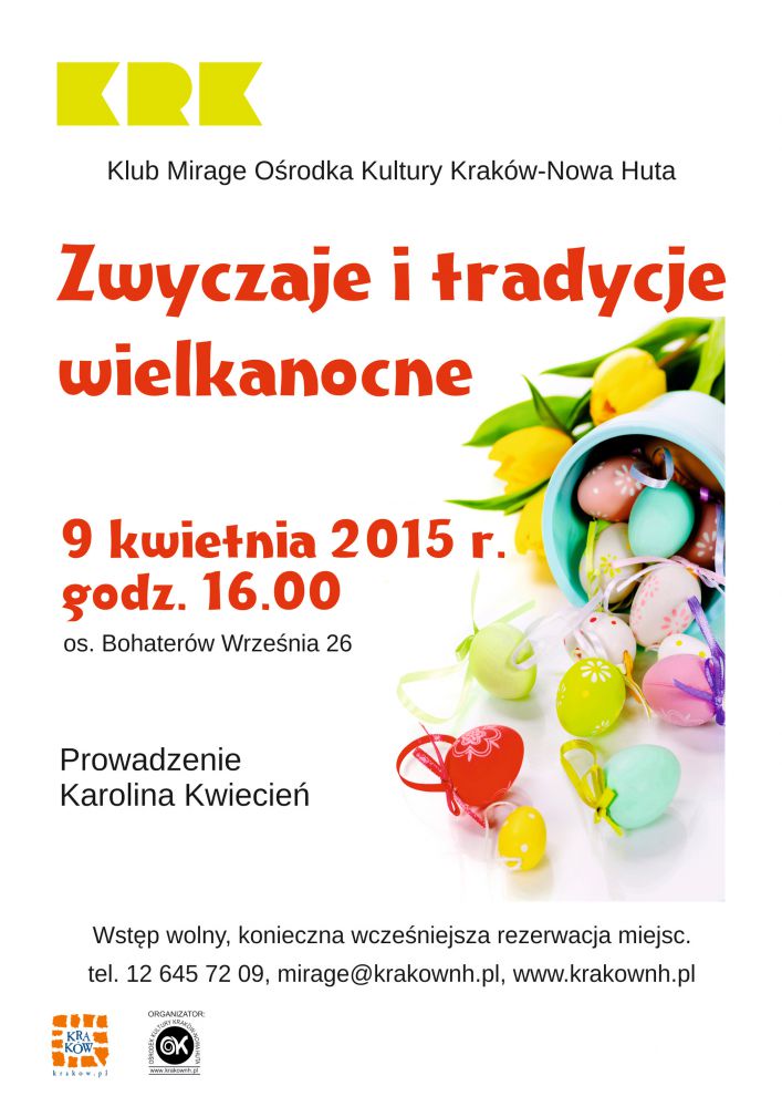 Wielkanoc to najstarsze i najważniejsze œwięto w religii chrzeœcijańskiej. Ten radosny czas obfituje w wiele zwyczajów. O obrzędach, tradycjach i zwyczajach, które znamy i pamiętamy, ale także o tych zapomnianych lub nieznanych w naszym obrębie kulturowym opowie etnograf – pani Karolina Kwiecień. Spotkanie odbędzie się 9 kwietnia br. o godz. 16.00 w Klubie Mirage Oœrodka Kultury Kraków-Nowa Huta (os. Bohaterów Wrzeœnia 26).