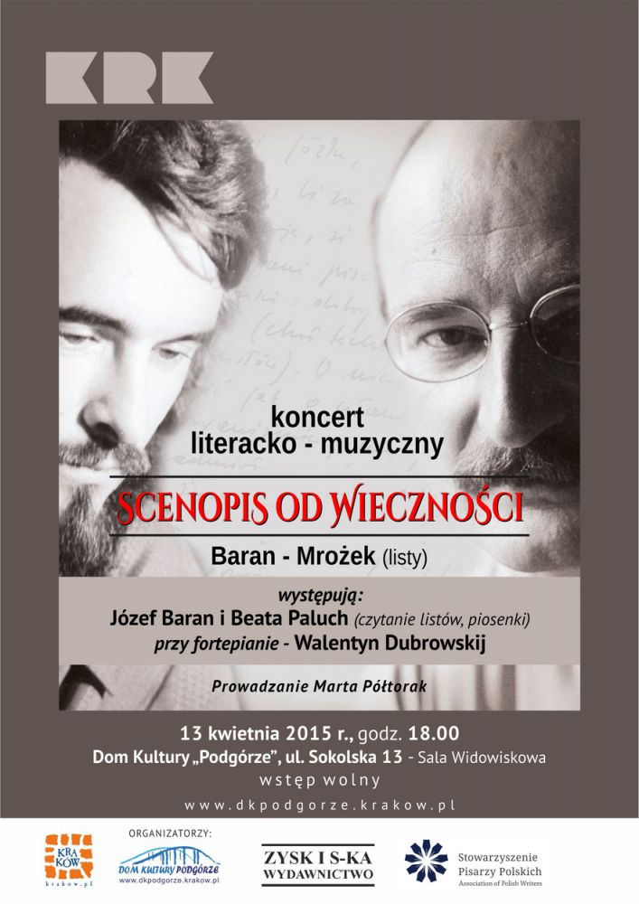Zapraszamy na koncert Koncert literacko muzyczny w wykonaniu Józefa Barana i Beaty Paluch. W czasie spotkania odczytane zostanš fragmenty listów Józefa Barana i Sławomira Mrożka.