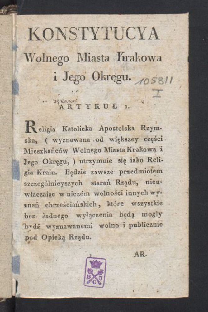 Zdjęcie: Konstytucja Wolnego Miasta Krakowa i jego okręgu, wł. Biblioteki Jagiellońskiej