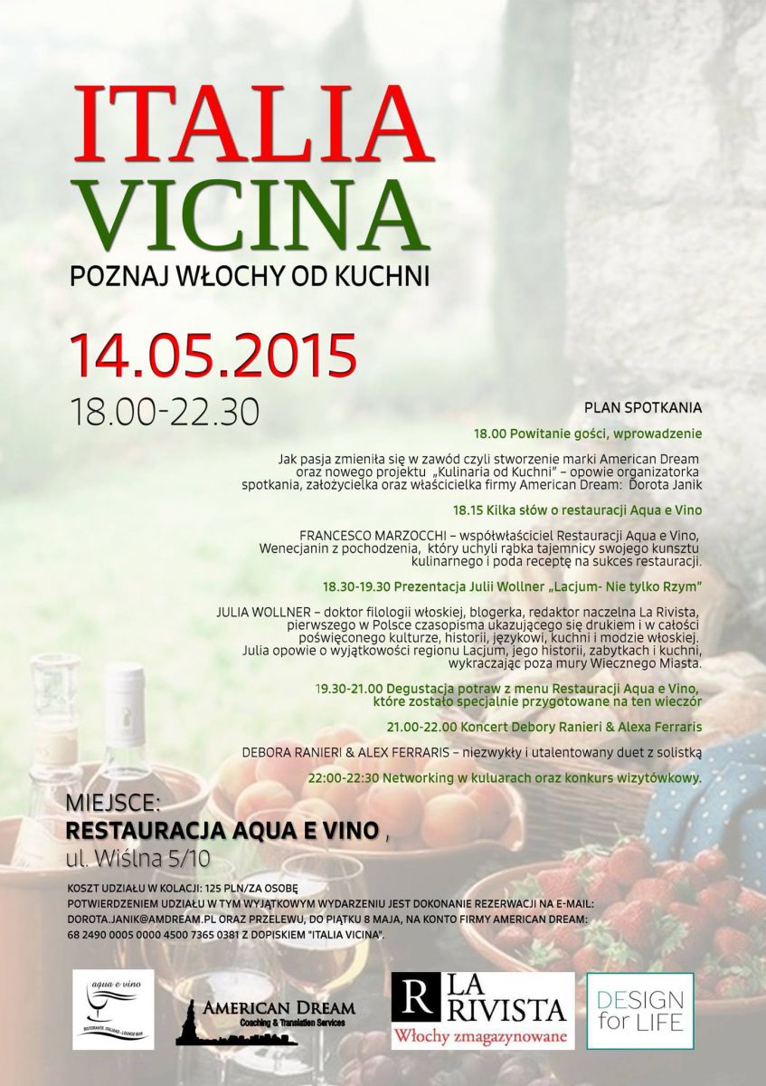Firma American Dream wraz z Restauracjš Aqua e Vino serdecznie zapraszajš na ucztę dla zmysłów. Będzie to wyjštkowa okazja, aby poznać kulinarne tajemnice Włoch i zasmakować specjałów szefa kuchni najlepszej restauracji w kategorii kuchnia włoska według rankingu Dziennika Polskiego za rok 2014.