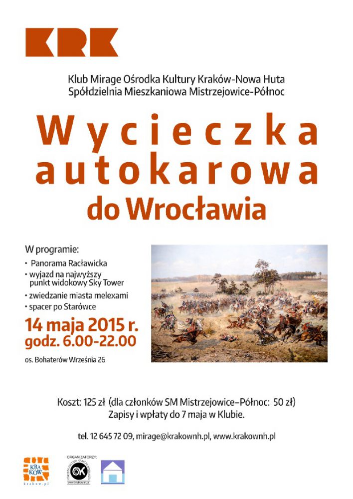 Wroc³aw jest piźkny, nietuzinkowy, zachwyca zabytkami, nowoczesnoci¹ i atmosfer¹. Warto jeden z majowych dni przeznaczyę na pobyt w miecie, które w 2016 roku bździe Europejsk¹ Stolic¹ Kultury i wiatow¹ Stolic¹ Ksi¹æki. 14 maja Klub Mirage Orodka Kultury Kraków-Nowa Huta (os. Bohaterów Wrzenia 26) organizuje autokarow¹ wycieczkź do Wroc³awia. W programie Wroc³awia znajd¹ siź: Panorama Rac³awicka, wyjazd na najwyæszy punkt widokowy Sky Tower, zwiedzanie Wroc³awia melexami, spacer po Starówce, udzia³ w pokazie tańcz¹cych fontann. Zapraszaj¹ Klub Mirage Orodka Kultury Kraków-Nowa Huta oraz Spó³dzielnia Mieszkaniowa Mistrzejowice-Pó³noc. Zapisy i wp³aty do 7 maja br. Wyjazd o godz. 6.00.