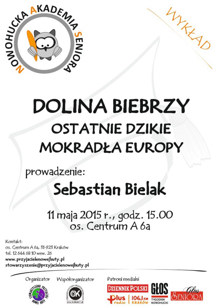 Zapraszamy 11 maja o godz. 15.00 na kolejny wykład dla Nowohuckiej Akademii Seniora (os. Centrum A 6a), który wygłosi Sebastian Bielak absolwent Akademii Górniczo-Hutniczej oraz Politechniki Krakowskiej, pracownik naukowodydaktyczny Instytutu Inżynierii i Gospodarki Wodnej PK, z zamiłowania przyrodnik i podróżnik. Słuchacze będš mieli możliwoć zobaczyć fotografie i usłyszeć opowieci z jego podróży po Dolinie Biebrzy.