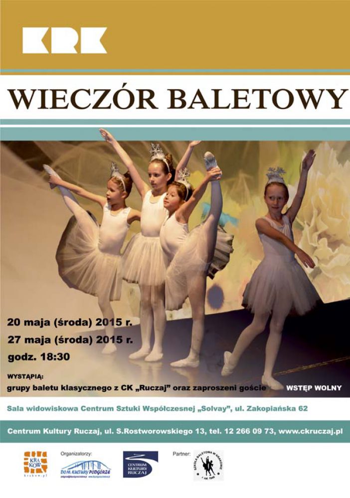 Centrum Kultury "Ruczaj" zaprasza na podsumowanie pracy uczniów grup baletowych w roku szkolnym 2014/2015. Na scenie zaprezentujš się wszystkie grupy oraz zaproszeni goœcie.