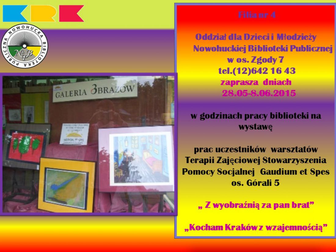 Podczas XVI Tygodnia Osób Niepełnosprawnych Kocham Kraków z Wzajemnociš w Bibliotece będzie prezentowana wystawa prac uczestników warsztatów Terapii Zajęciowej Stowarzyszenia Pomocy Socjalnej Gaudium et Spes. Biblioteka swoimi działaniami uwrażliwia mieszkańców Nowej Huty na problemy osób z niepełnosprawnociš, przeciwdziała wykluczeniu społecznemu tych osób oraz umożliwia im lepsze funkcjonowanie w rodowisku. Sporód wielu działań realizowanych wspólnie ze szkołami, przedszkolami i orodkami terapeutycznymi należy wymienić aktywizację poprzez edukację i sztukę.