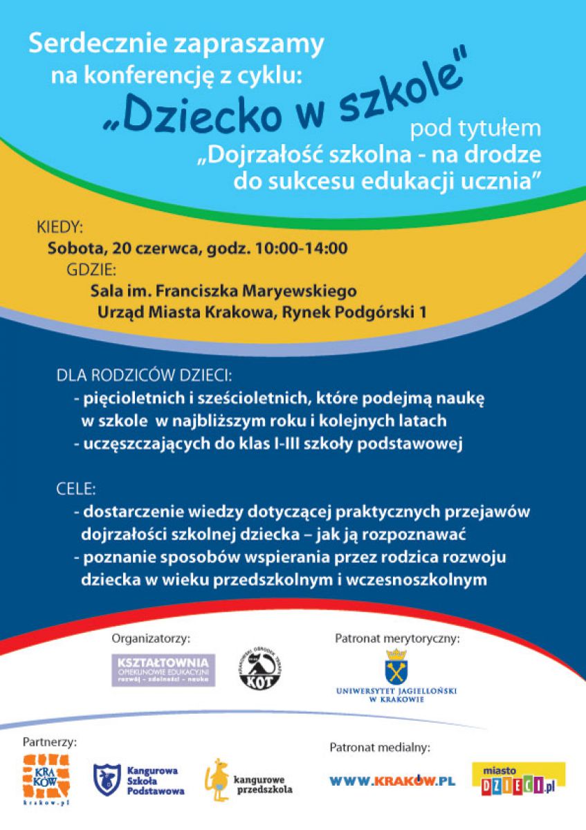 | Pierwszy w Krakowie cykl konferencji skierowany do rodziców, poruszajšcy ważne tematy dotyczšce dziecka w szkole. Inicjatywa jest zaproszeniem do dialogu. |