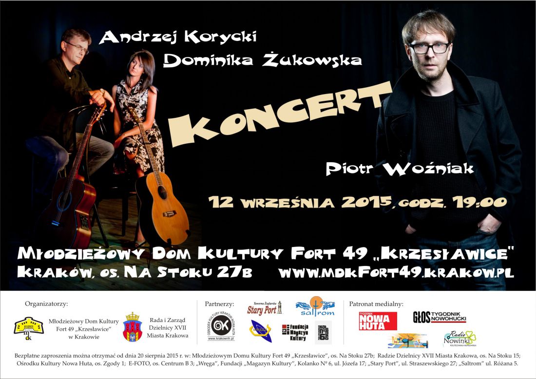 W sobotę 12 wrzenia 2015 r., na dziedzińcu fortecznym MDK Fort 49 Krzesławice w Krakowie, os. Na Stoku 27b, wystšpiš w duecie Dominika Żukowska i Andrzej Korycki oraz w solowym recitalu Piotr Woniak. Występ odbędzie się w ramach koncertu Pożegnanie lata. Poczštek o godzinie 19:00. Wstęp bezpłatny.
