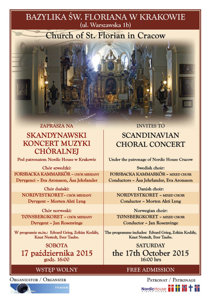 W sobotę, 17 paŸdziernika 2015, o godz.16:00 odbędzie się koncert trzech chórów mieszanych ze Skandynawii, w Bazylice Œw. Floriana, w Krakowie, ul. Warszawska 1b.