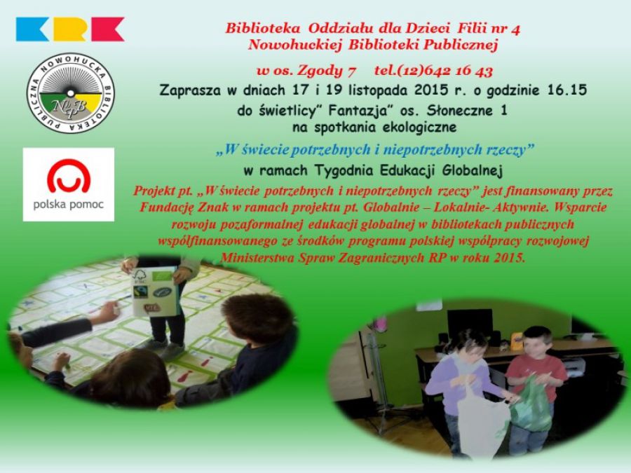 Biblioteka zaprasza na spotkania ekologiczne W wiecie potrzebnych i niepotrzebnych rzeczy, odbywajšce się w ramach 17. edycji europejskiego Tygodnia Edukacji Globalnej. Wydarzenie jest finansowane przez Fundację Znak w ramach projektu pt. Globalnie Lokalnie- Aktywnie. Celem zajęć jest podnoszenie wiadomoci konsumenckiej uczestników spotkania. Słuchacze zapoznajš się z zagadnieniem odpowiedzialnej konsumpcji, dowiedzš się na co należy zwracać uwagę podczas robienia zakupów, aby wybrać ekologiczne opakowania.