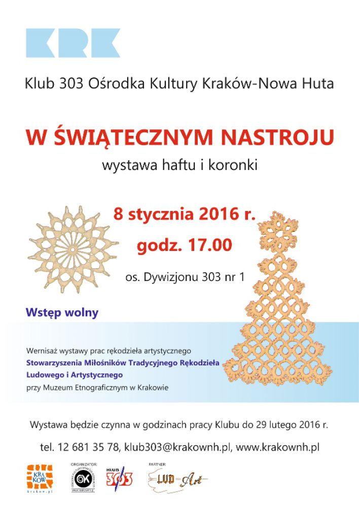 8 stycznia o godz. 17.00 odbędzie się w Klubie 303 Oœrodka Kultury Kraków-Nowa Huta (os. Dywizjonu 303 nr 1) wernisaż wystawy rękodzieła artystycznego (hafty: płaskie, richelieu, krzyżykowe, koronki: klockowe, szydełkowe, czółenkowe: frywolitka i inne) autorstwa członkiń Stowarzyszenia Miłoœników Tradycyjnego Rękodzieła Ludowego i Artystycznego Lud-Art. Stowarzyszenie powstało w 2005 roku, lecz jego korzenie sięgajš Klubu Hafciarskiego działajšcego od 1993 roku przy Krakowskim Oddziale Polskiego Towarzystwa Ludoznawczego z siedzibš w Muzeum Etnograficznym. Stowarzyszenie przywišzuje wielkš wagę do pielęgnowania tradycji naszych przodków oraz krzewienia tradycyjnej sztuki ludowej prowadzšc bogatš działalnoœć wystawienniczš i dydaktycznš oraz promujšc rękodzieło ludowe i artystyczne.