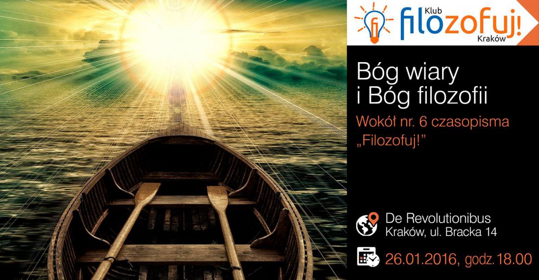 Po raz drugi zorganizowaliœmy dla Was spotkanie w Krakowie w ramach Klubu „Filozofuj!”. Tym razem tematem będzie: „Bóg wiary i Bóg filozofii. Wokół nr. 6 „Filozofuj!”. Odbędzie się ono 26 stycznia 2016 o godz. 18 w De Revolutionibus. Books&Cafe przy ul. Brackiej 14 w Krakowie, gdzie można kupić drukowanš wersję magazynu. Goœćmi specjalnymi spotkania będš: prof. Jan Woleński, dr hab. Piotr Bartula oraz dr Michał Bizoń. Zapraszamy mieszkańców Krakowa i okolic.