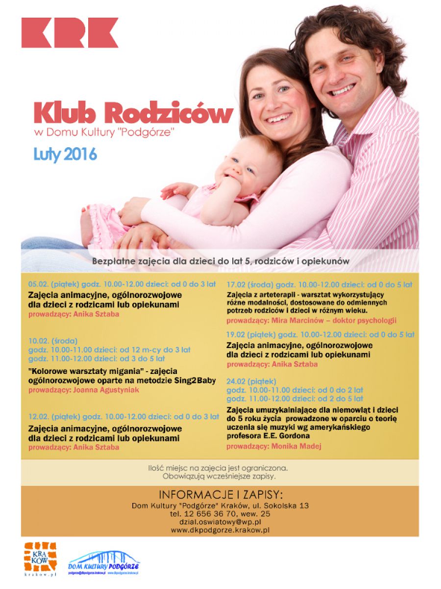 Od lutego zostaje uruchomiony w naszej placówce Klub Rodziców - bezpłatne zajęcia dla dzieci do lat 3, rodziców i opiekunów. W ofercie m.in Akademia Młodej Mamy, zajęcia umuzykalniajšce, kurs pierwszej pomocy przedmedycznej, warsztaty dla kobiet w cišży i ich partnerów oraz zajęcia animacyjne, ruchowe, arteterapii i inne.