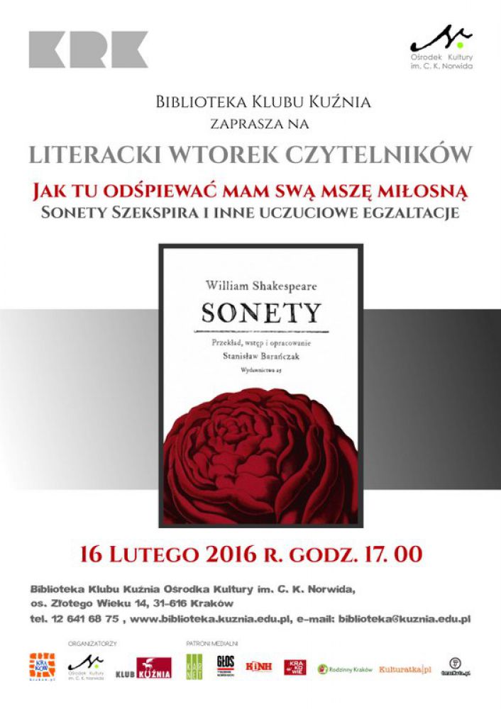 Literacki Wtorek Czytelników powięcony literaturze miłosnej, zarówno tej najsławniejszej, jak i tej w osobistym wyborze uczestników spotkania. Motywem uczuciowych rozważań będš cytaty z sonetów Williama Szekspira w tłumaczeniu Stanisława Barańczaka.