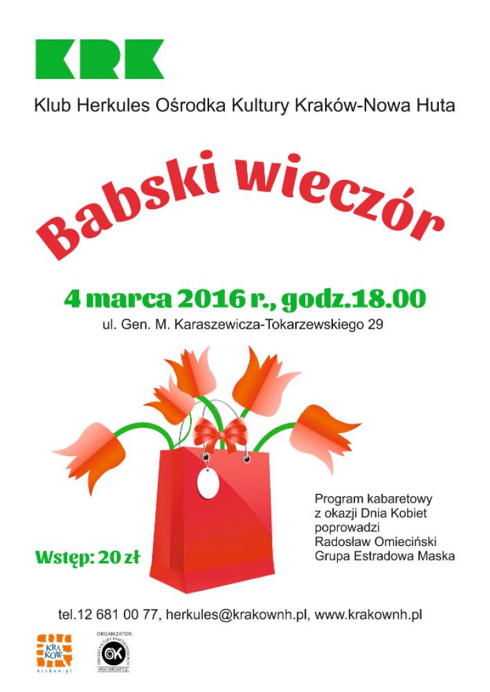 Każda kobieta zasługuje na to, by nosić jš na rękach. Drogie Panie, zapomnijcie na chwilę o codziennych obowišzkach. Zapraszamy Was na wyjštkowe spotkanie z okazji Dnia Kobiet które odbędzie się 4 marca o godz. 18:00 w Klubie Herkules Orodka Kultury Kraków-Nowa Huta (ul. Gen. M. Karaszewicza-Tokarzewskiego 29). Wszystkie panie będš mogły spędzić miło czas słuchajšc i bawišc się podczas programu kabaretowego w wykonaniu Radosława Omiecińskiego. Informacje i zapisy w godzinach otwarcia Klubu do 2 marca.