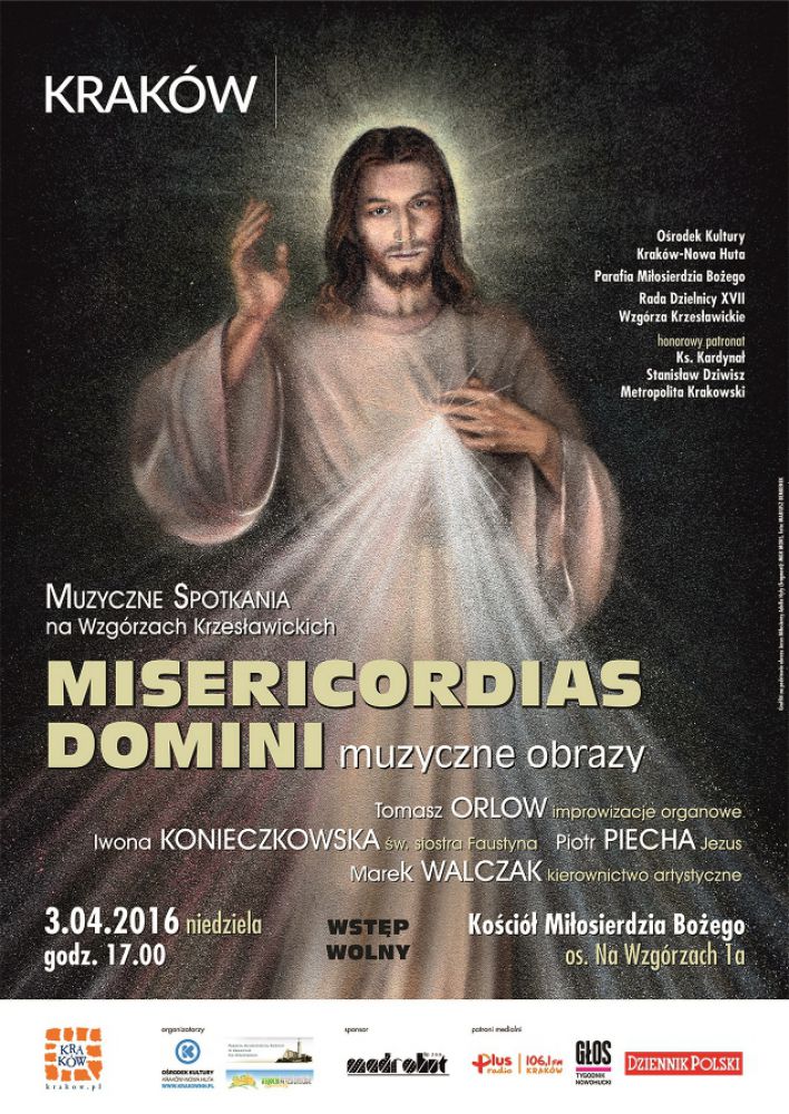 W Roku Jubileuszowym, ogłoszonym przez Papieża Franciszka Nadzwyczajnym Rokiem Miłosierdzia, organizatorzy cyklu Muzyczne Spotkania na Wzgórzach Krzesławickich zapraszajš na koncert inspirowany Dzienniczkiem œw. Siostry Faustyny, osoby tak ważnej dla szerzšcego się kultu Miłosierdzia Bożego. Koncert Misericordias Domini – muzyczne obrazy odbędzie się w niedzielę 3 kwietnia o godzinie 17.00, w koœciele p.w. Miłosierdzia Bożego na Wzgórzach Krzesławickich (os. Na Wzgórzach 1a). Wydarzenie uœwietni także uroczystoœci odpustowe z racji przypadajšcego na tę niedzielę Œwięta Bożego Miłosierdzia.
