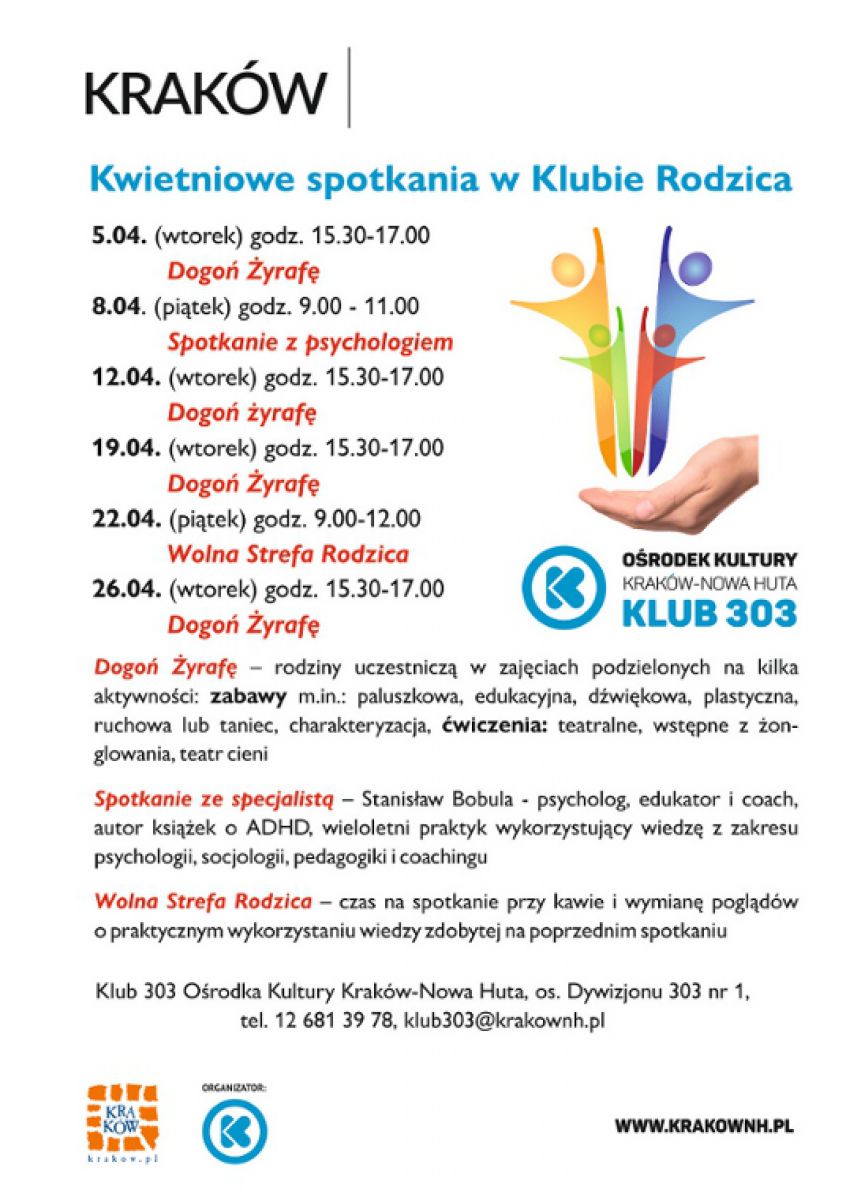 Do czego wykorzystać nakrętki z butelek PET? Czy luneta może być papierowa? Jakie mogš być jeszcze zabawki? Na te pytania będzie można znaleć odpowied 5 kwietnia o godz. 15:30 podczas kolejnego spotkania w Klubie Rodzica gonišc żyrafę w Klubie 303 Orodka Kultury Kraków-Nowa Huta (os. Dywizjonu 303 nr 1). Na poczštku zajęć oczywicie nie zabraknie paluszkowych zabaw, czy tak lubianych nie tylko przez dzieci, masażyków. Na rozgrzewkę potańczymy i popiewamy, żeby w końcu przejć do dzieła, czyli wykonać proste zabawki z recyklingu.