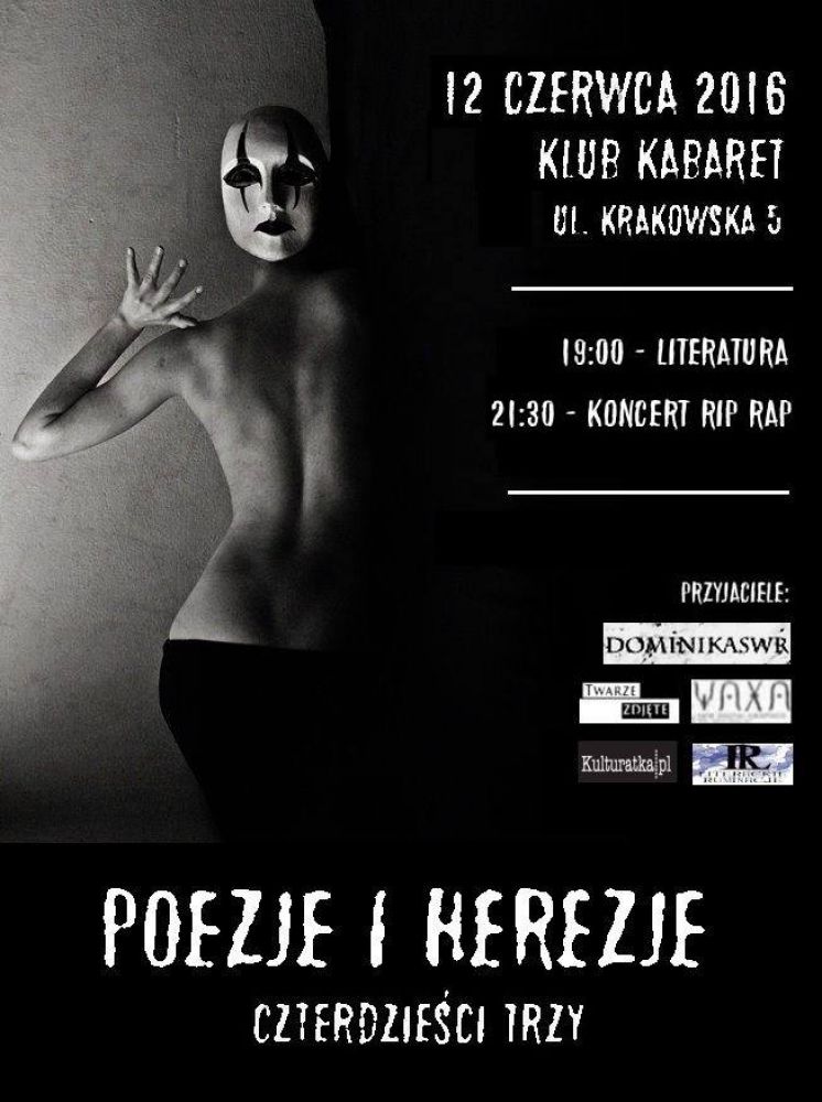 Zapraszamy Państwa na czterdzieste trzecie Poezje i herezje. Zobaczymy się po raz ostatni przed wakacjami, a ugoci nas, po raz kolejny, Klub Kabaret. Tym razem zaczniemy o godzinie 19:00, bo dochodzš nas słuchy, że kolidujemy z meczem, przez który częci z Pańswa bylibymy mniej po drodze.