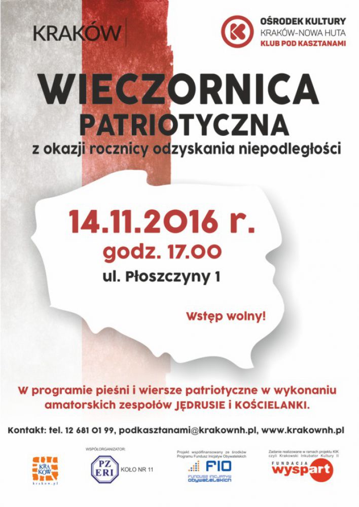 Z okazji więta Niepodległoci Koło nr 11 Polskiego Zwišzku Emerytów, Rencistów i Inwalidów oraz Klub Pod Kasztanami Orodka Kultury Kraków-Nowa Huta zapraszajš na Wieczornicę Patriotycznš, która odbędzie się 14 listopada o godz. 17.00. W programie spotkania znajdš się pieni i wiersze patriotyczne w wykonaniu zespołów Jędrusie i Kocielanki. Zadanie realizowane w ramach projektu KIK, czyli Krakowski Inkubator Kultury II. Projekt współfinansowany ze rodków Programu Fundusz Inicjatyw Obywatelskich. Zapraszamy od Klubu Pod Kasztanami (ul. Płoszczyny 1).