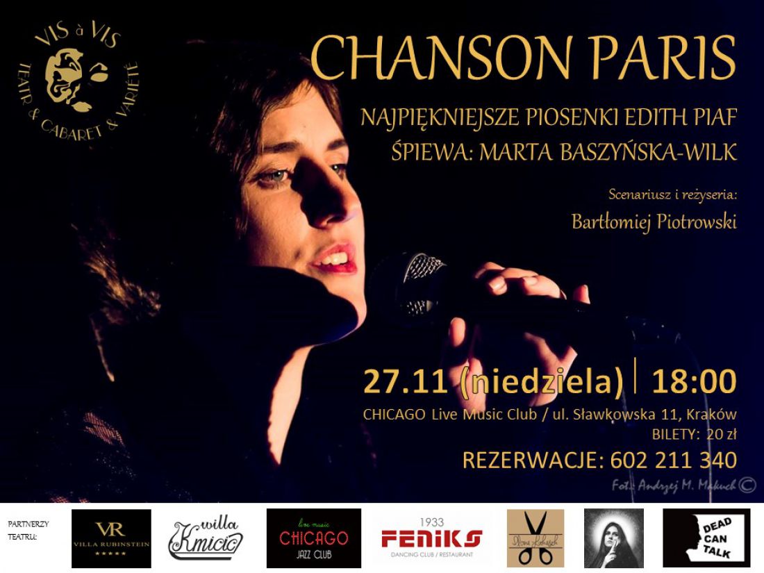 W wyjštkowym programie „CHANSON PARIS” - najpiękniejsze piosenki Edith Piaf, francuskie szlagiery oraz przeboje Ewy Demarczyk, a także wiersze Jacquesa Preverta i Haliny Poœwiatowskiej - zaœpiewa Gwiazda scen muzycznych, artystka Teatru VIS a VIS - Marta Baszyńska - Wilk.