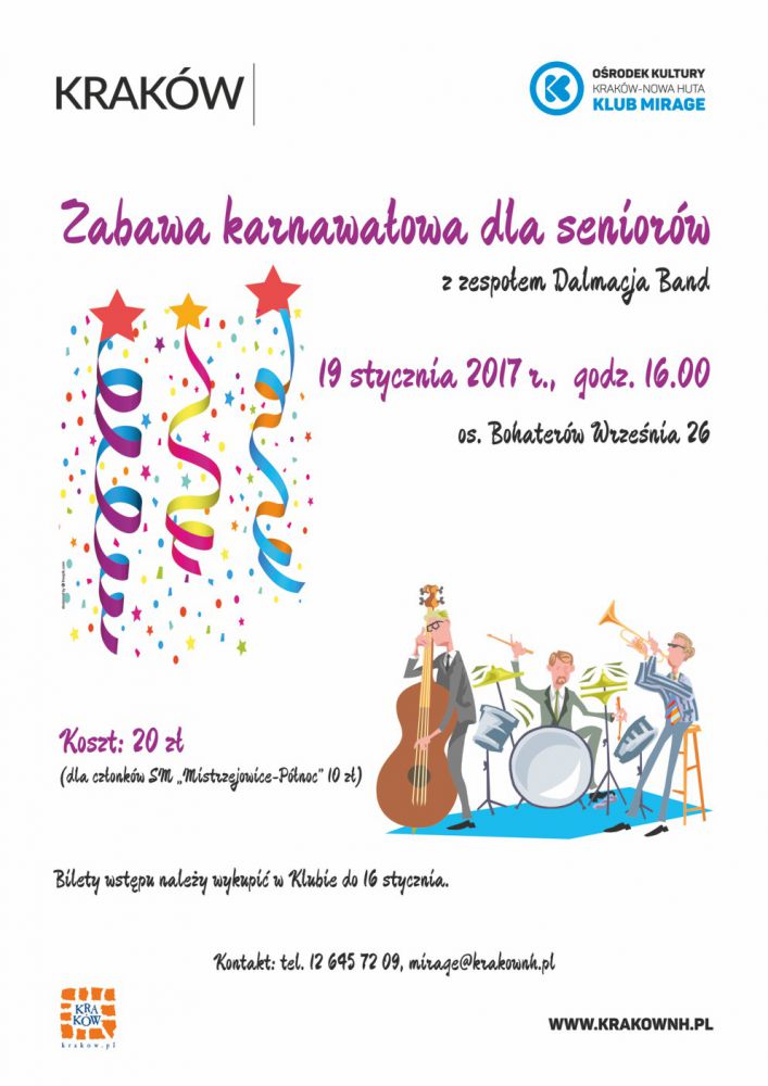 Klub Mirage Orodka Kultury Kraków-Nowa Huta (os. Bohaterów Wrzenia 26) zaprasza seniorów na Zabawę karnawałowš 19 stycznia o godz. 16.00. Okres karnawału w pełni. Już dzi można zaczšć planować w jakiej atmosferze będziemy go spędzać. Tych, którzy chcš go więtować w szampańskim nastoju i przy skocznej muzyce zaprasza Klub Mirage Orodka Kultury Kraków-Nowa Huta, gdzie tradycyjnie odbędzie się zabawa karnawałowa dla seniorów przy muzyce na żywo. Do tańca przygrywać będzie zespół Dalmacja Band, który umili wieczór dobrš muzykš oraz wspaniałym humorem.