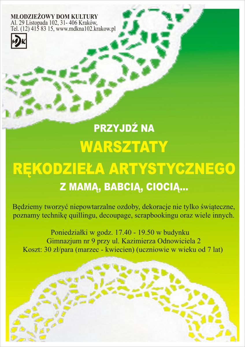 PRZYJD NA WARSZTATY RĘKODZIEŁA ARTYSTYCZNEGO Z MAMĽ, BABCIĽ, CIOCIĽ...