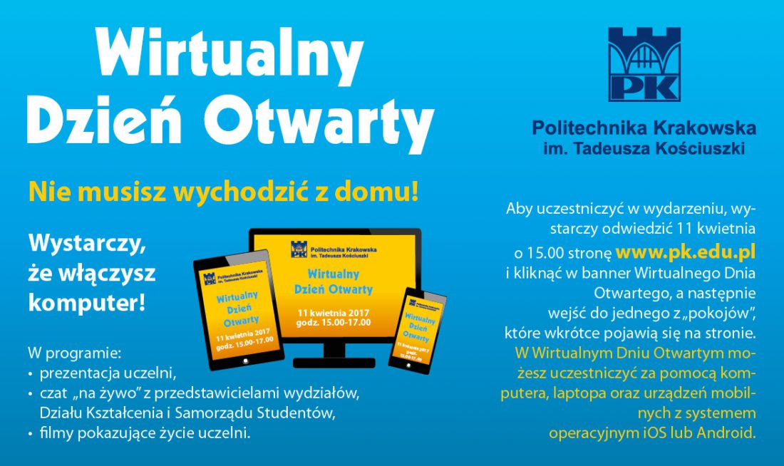 Zapraszamy wszystkich kandydatów na studia na Wirtualny Dzień Otwarty, który odbędzie się we wtorek 11 kwietnia w godzinach 15.00-17.00 i pozwoli Wam poznać Politechnikę Krakowskš.