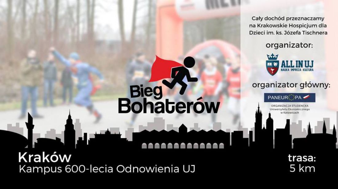 Bieg Bohaterów to projekt tworzony z organizacjš Paneuropa z Katowic, która rok temu zorganizowała pierwszš edycję biegu. W tym roku to wydarzenie odbędzie się również w Krakowie. Pobiec można po zapłaceniu 20 zł a cały dochód z biegu zostanie przeznaczony na Hospicjum dla Dzieci im. ks. Józefa Tischnera, który od 2004 roku tworzy domowš atmosferę dla cierpišcych maluchów.