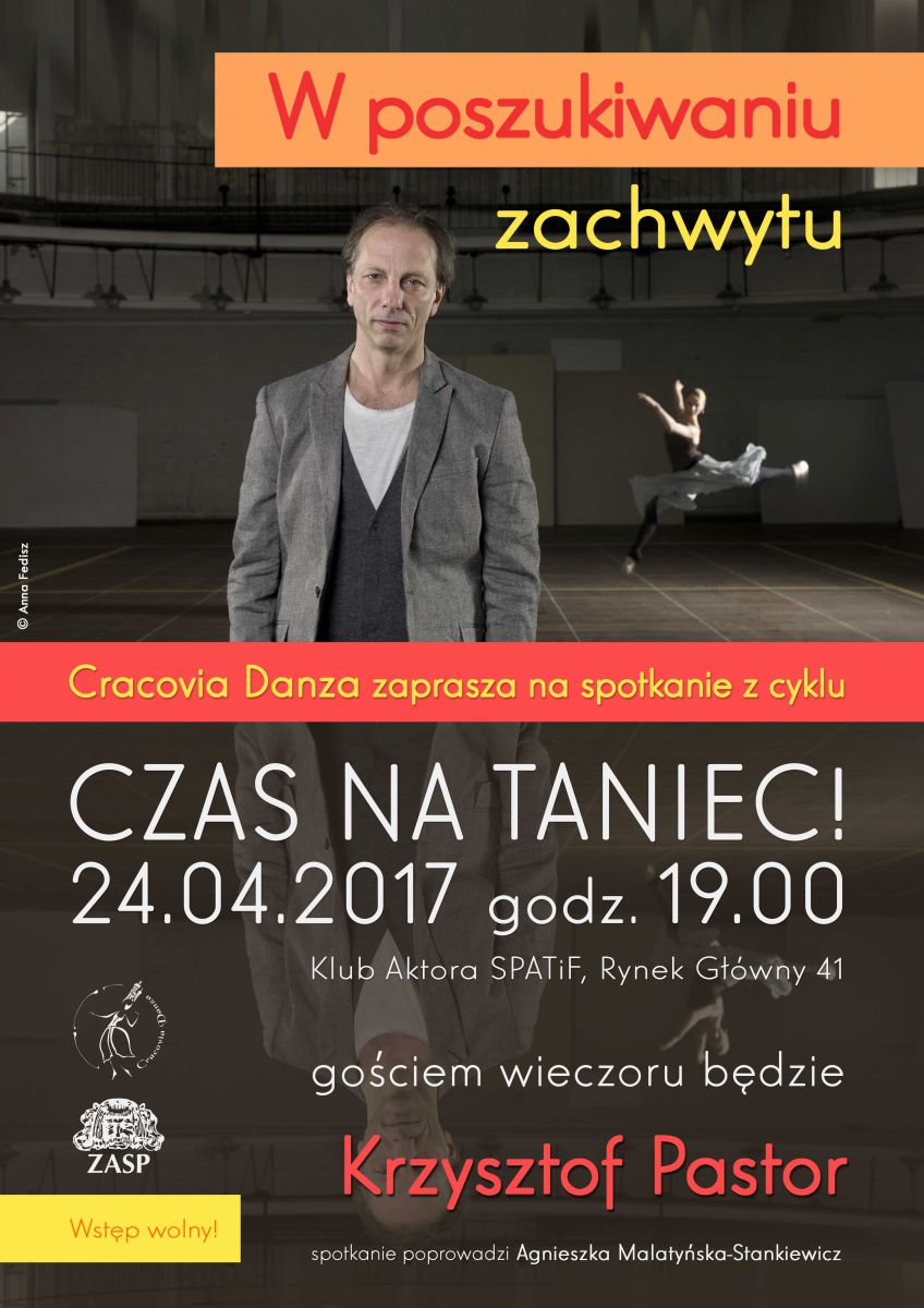 Już w poniedziałek, 24 kwietnia Krzysztof Pastor będzie goœciem spotkania CZAS NA TANIEC!, cyklu przygotowywanego przez Balet Cracovia Danza. Spotkanie, które otrzymało tytuł „W poszukiwaniu zachwytu”, rozpocznie się o godz. 19 w Klubie Aktora SPATiF, Rynek Główny 41. Rozmowę poprowadzi Agnieszka Malatyńska-Stankiewicz. Spotkanie odbędzie się z okazji przypadajšcego 29 kwietnia Międzynarodowego Dnia Tańca.