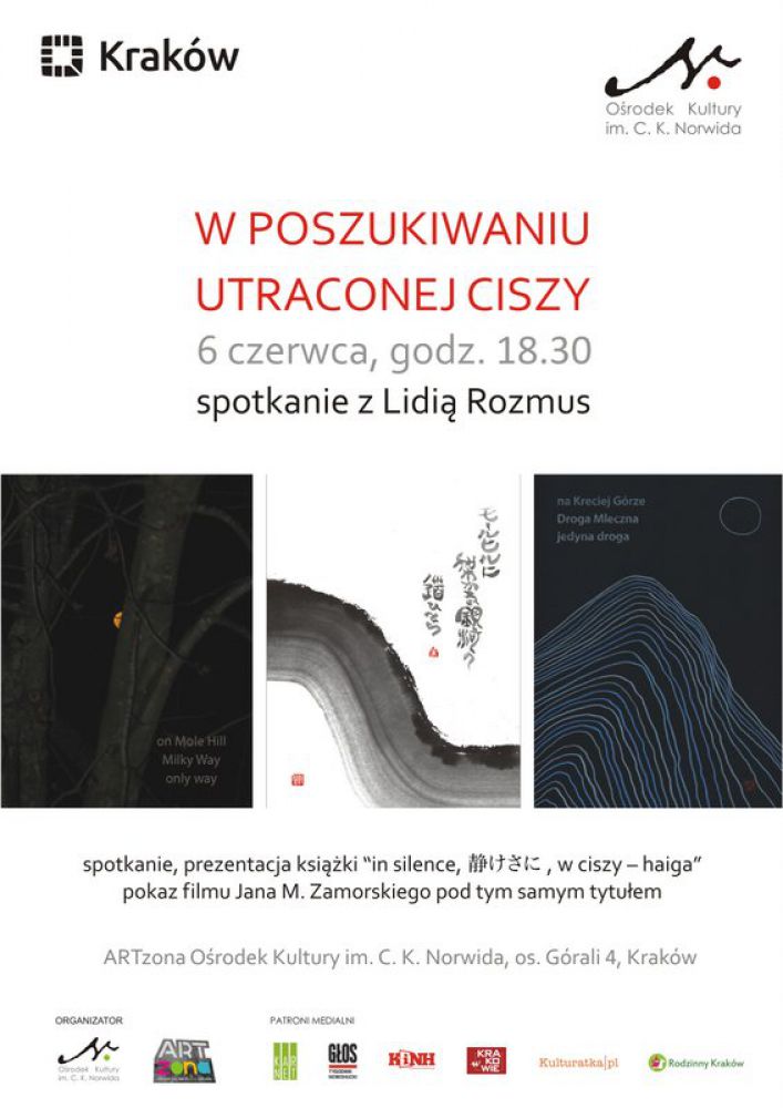 Zaprezentowana będzie ksiażka-portfolio “in silence, 静けさに, w ciszy – haiga” połšczona z filmem Jana M. Zamorskiego pod tym samym tytułem. Spotkanie odbywa się w ramach cyklu Odblokuj Wschód – Japonia.