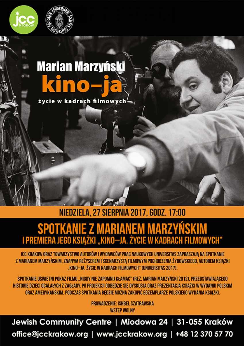 JCC Krakow oraz Towarzystwo Autorów i Wydawców Prac Naukowych UNIVERSITAS zapraszajš na spotkanie z Marianem Marzyńskim, znanym reżyserem i scenarzystš filmowym pochodzenia żydowskiego, autorem ksišżki Kinoja. Życie w kadrach filmowych (Universitas 2017).