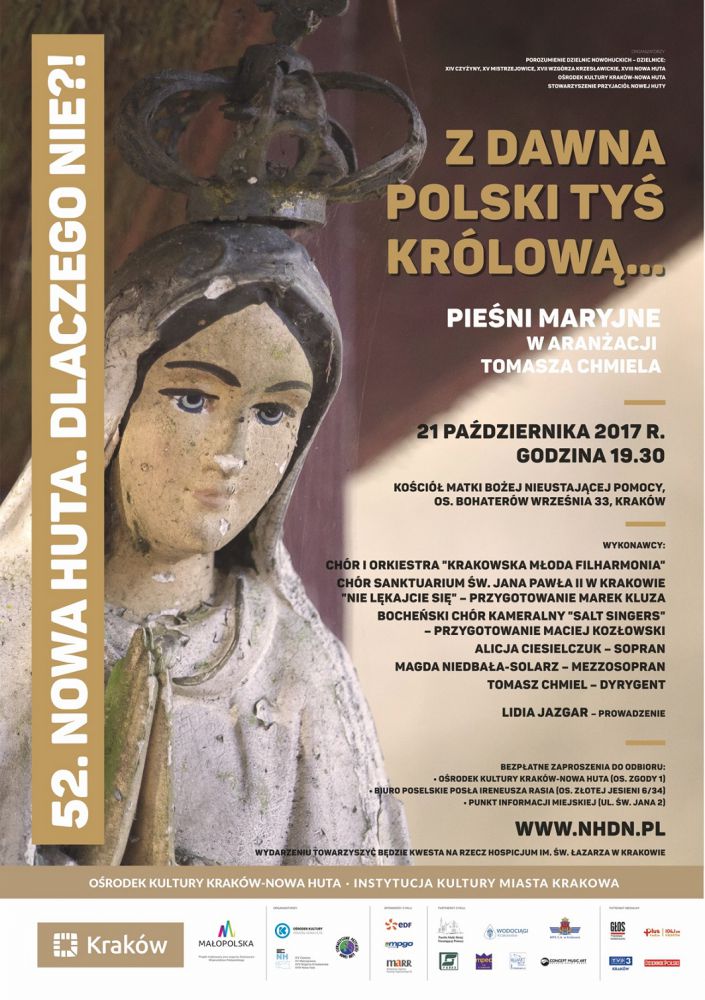 Po wakacyjnej przerwie, nowohucki cykl społeczno-kulturalny Nowa Huta. Dlaczego Nie?! zaprasza na kolejne wydarzenie. Tym razem Organizatorzy zapraszajš do koœcioła Matki Bożej Nieustajšcej Pomocy na os. Bohaterów Wrzeœnia 33, gdzie będzie można usłyszeć tradycyjne pieœni maryjne w aranżacjach autorstwa Tomasza Chmiela. Koncert odbędzie się w sobotę 21 paŸdziernika, poczštek o godz. 19.30.