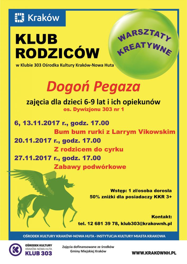 Wstęp: 1 zł od osoby dorosłej/zajęcia. Osoby posiadajšce Krakowskš Kartę Rodzinnš 3+ płacš 0,5 zł. Zajęcia dofinansowane ze rodków Gminy Miejskiej Kraków.