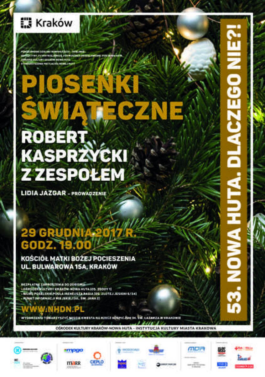 Organizatorzy cyklu: Porozumienie Dzielnic Nowohuckich - Dzielnice: XIV Czyżyny, XV Mistrzejowice, XVII Wzgórza Krzesławickie, XVIII Nowa Huta, Oœrodek Kultury Kraków-Nowa Huta oraz Stowarzyszenie Przyjaciół Nowej Huty zapraszajš mieszkańców Krakowa na koncert bożonarodzeniowy pt. „Piosenki œwišteczne” w wykonaniu Roberta Kasprzyckiego z zespołem w składzie: Maks Szelęgiewicz, Krzysztof Wyrwa i Adam Zadora. Wyjštkowa atmosfera tego muzycznego wieczoru znajdzie swoje odbicie w specjalnym repertuarze, składajšcym się z kolęd, pastorałek oraz piosenek autorskich dotyczšcych zimy. Uczestnicy posłuchajš m.in. utworów takich jak: Zimowa Baœń, Kay i Gerda, Zadymka, Postój zimowy czy Zapiszę œniegiem w kominie. Koncerty Roberta Kasprzyckiego gwarantujš niezapomniane przeżycia. W tym wypadku słuchacze, oprócz walorów czysto artystycznych, otrzymajš możliwoœć wspólnego i radosnego œpiewania kolęd wraz z artystš. Wydarzenie poprowadzi Lidia Jazgar.
