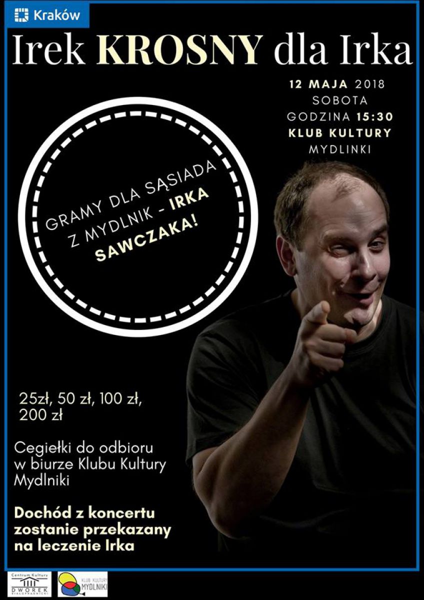 Szanowni Państwo kwestia niezwykle ważna i warta zatrzymania! Mianowicie 12 maja 2018 roku o godz. 15.30 odbędzie się CHARYTATYWNY WYSTĘP najsłynniejszego polskiego mima Ireneusza Krosnego na rzecz mieszkańca Mydlnik- Ireneusza Sawczaka chorujšcego na złoliwy nowotwór mózgu. Artysta wystšpi z nowym programem pt. Mowa ciała. Dochód z występu zostanie przekazany na leczenie Irka Sawczaka , cegiełki w cenie 25 zł, 50 zł, 100 zł, 200 zł można nabyć w Klubie Kultury Mydlniki przed występem. Z całego serca zapraszamy i zachęcamy do wsparcia!