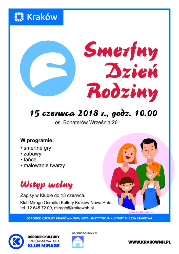 Klub Mirage Orodka Kultury Kraków-Nowa Huta (os. Bohaterów Wrzenia 26) zaprasza 15 czerwca o godz. 10.00 na Dzień rodziny. Tegorocznej edycji patronować będš Smerfy - małe niebieskie ludziki uwielbiane przez najmłodszych, a bardzo dobrze znane rodzicom z ich dzieciństwa. Na uczestników czekajš smerfne gry, zabawy, zgadywanki i inne niespodzianki. Nie zabraknie smerfnych hitów. Mile widziane biało-niebieskie stroje. Do Wioski Smerfów zaprasza Papa Smerf ze Smerfetkš. Tylko uważajcie, w okolicy widziano Gargamela z Klakierem.