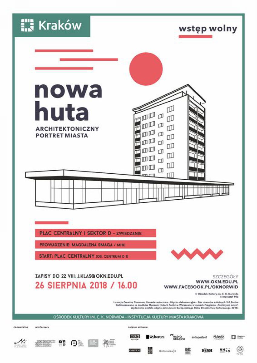 Nowa Huta architektoniczny portret miasta cykl działań animacyjno-edukacyjnych w postaci spacerów, zwiedzania lub prelekcji portretujšcych architektoniczne dziedzictwo kulturowe Nowej Huty z drugiej połowy XX w. W ramach przedsięwzięcia wydana zostanie recenzowana publikacja oraz zaprojektowane będš tzw. ikony miejskie, czyli schematyczne rysunki-piktogramy przedstawiajšce najważniejsze obiekty na bazie których powstanie seria gadżetów promujšcych lokalne dziedzictwo kulturowe.