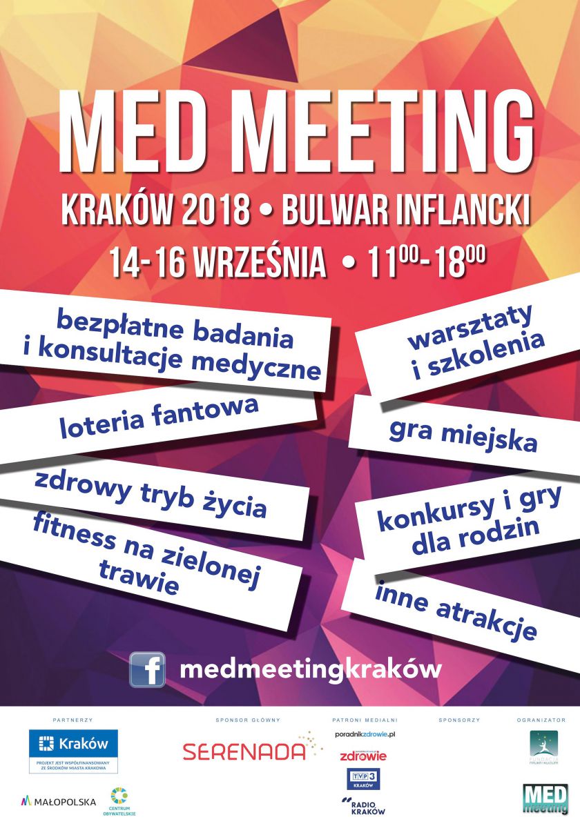 Med Meeting Kraków 2018 to trzydniowe spotkania plenerowe, które skupiajš się wokół zagadnień medycyny, profilaktyki zdrowia, edukacji prozdrowotnej i zdrowego trybu życia. Mieszkańcy Krakowa, którzy wezmš w nim udział będš mieli okazję spędzić wartoœciowy czas w atmosferze gier, zabaw i konkursów, a także dowiedzš się jak dbać o zdrowie swoje i najbliższych. Co jeszcze czeka uczestników wydarzenia? Bezpłatne badania i konsultacje medyczne, loteria fantowa, fitness na zielonej trawie, warsztaty i szkolenia, gra miejska, a także konkursy i gry dla rodzin oraz mnóstwo innych atrakcji.