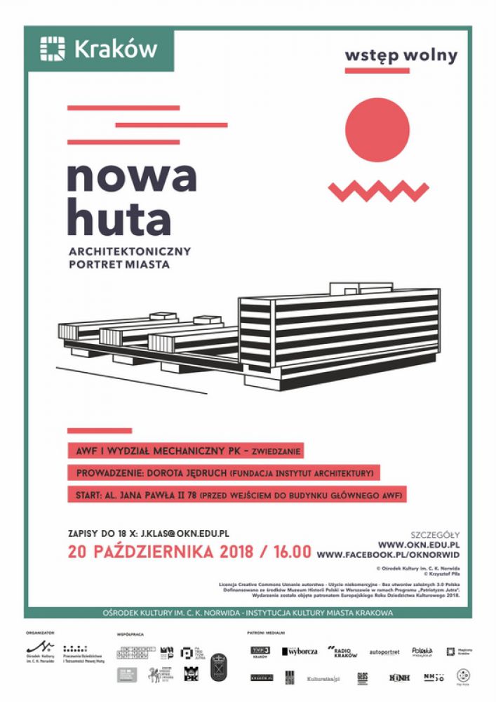 Zwiedzanie kampusu Akademii Wychowania Fizycznego i Wydziału Mechanicznego Politechniki Krakowskiej im. T. Kociuszki w Czyżynach w ramach projektu Nowa Huta architektoniczny portret miasta. Prowadzenie: Dorota Jędruch (Fundacja Instytut Architektury). Zapisy do 18 X: j.klas@okn.edu.pl. Wstęp wolny.
