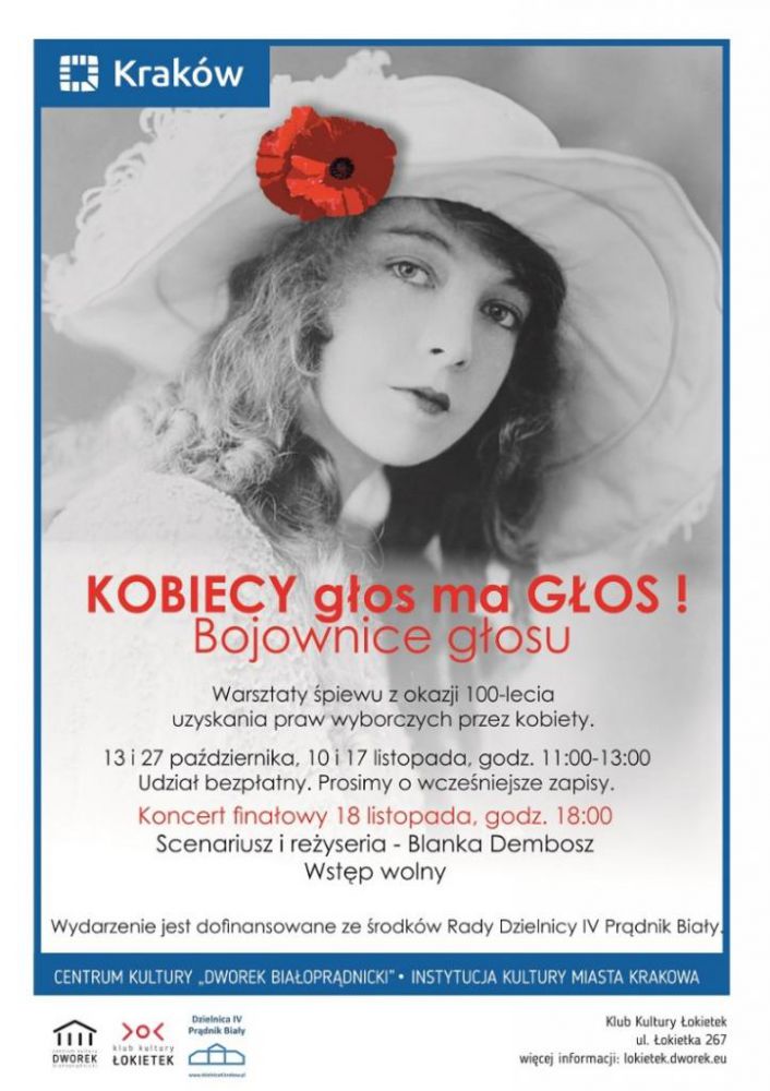 Klub Kultury Łokietek zaprasza do udziału w wyjštkowym projekcie z okazji 100-lecia uzyskania praw wyborczych przez kobiety. Przed nami cztery warsztaty œpiewu + koncert finałowy, który połšczy pokolenia i umiejętnoœci.